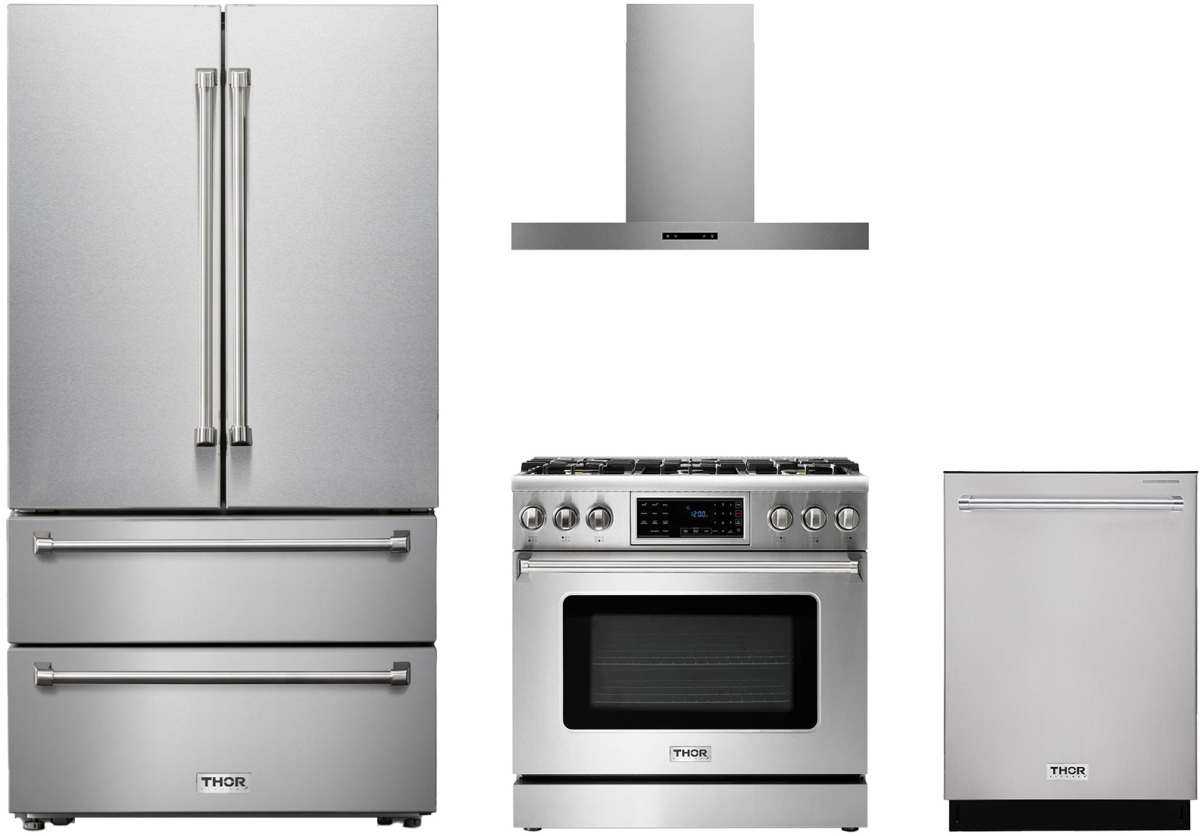 Thor Kitchen® 4 Piece Stainless Steel Kitchen Package with a freestanding gas range, French door refrigerator, built in dishwasher and wall mounted range hood.Read More