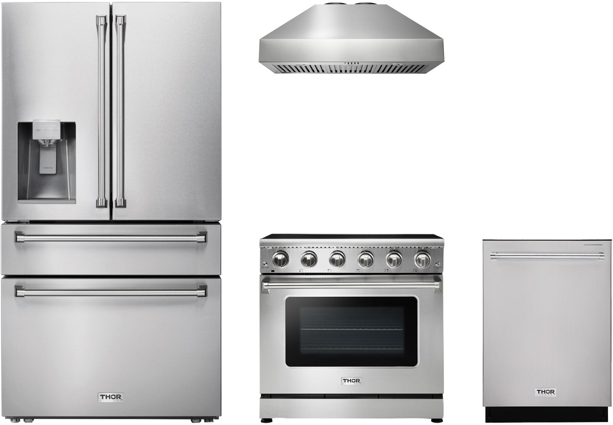 Thor Kitchen® 4 Piece Stainless Steel Kitchen Package with a freestanding electric range, French door refrigerator, wall mounted range hood and built in dishwasher.Read More
