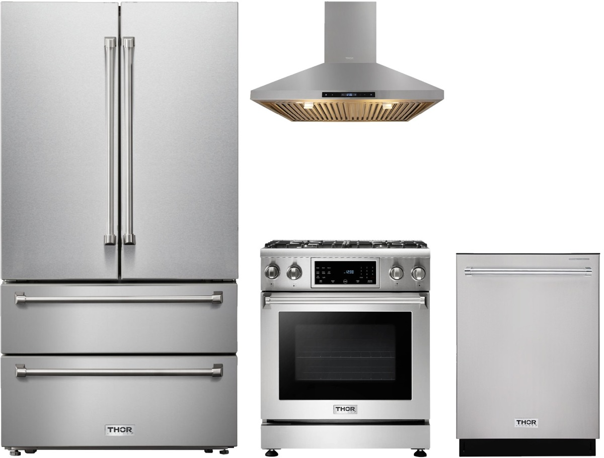 Thor Kitchen® 4 Piece Stainless Steel Kitchen Package with a freestanding gas range, French door refrigerator, built in dishwasher and wall mounted range hood.Read More
