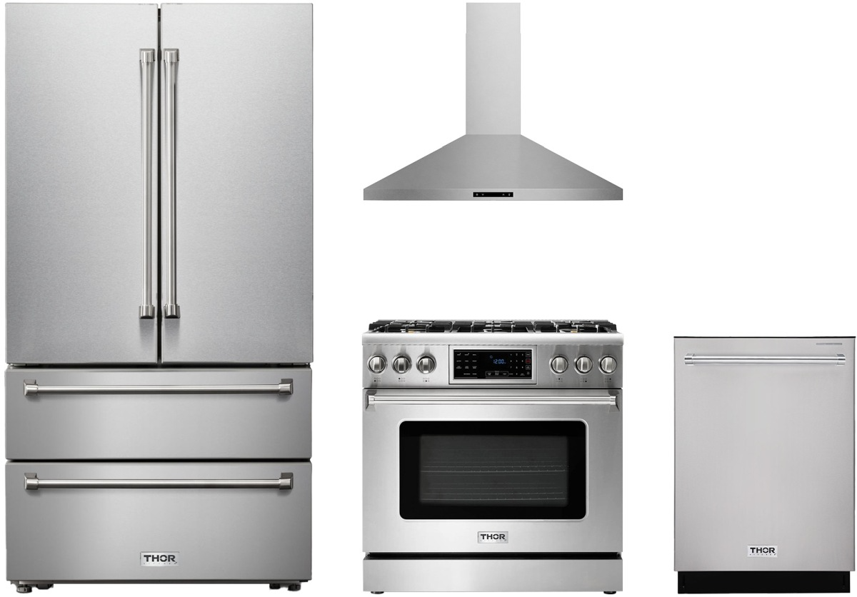 Thor Kitchen® 4 Piece Stainless Steel Kitchen Package with a freestanding gas range, French door refrigerator, built in dishwasher and wall mounted range hood.Read More