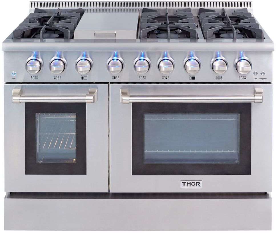 A 48 inch gas range in stainless steel featuring a double oven, 6 sealed burners, griddle, continuous grates, blue porcelain interior, 4.2 cu. ft. oven capacity and commercial convection fan.Read More